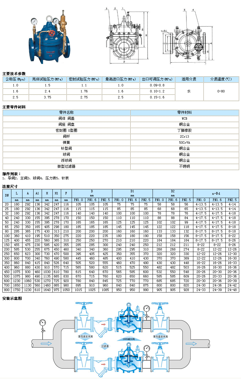 200X減壓穩(wěn)壓閥由主閥、導(dǎo)閥、針閥、球閥、微型過濾器和壓力表組成水力控制接管系統(tǒng)。使用時(shí),當(dāng)調(diào)定出口壓力后,能自動保持穩(wěn)定出口壓力。本產(chǎn)品利用導(dǎo)閥自力控制,不需要其它裝置和能源,保養(yǎng)簡便,壓力控制準(zhǔn)確度高,受進(jìn)口壓力和流量影響小,減壓穩(wěn)壓可靠。本系列閥門產(chǎn)品廣泛用于高層建筑、生活區(qū)等供水管網(wǎng)系統(tǒng)及城市供水工程。當(dāng)閥門從進(jìn)口端給水時(shí),水流過針閥進(jìn)入主閥控制室,出口壓力通過導(dǎo)管作用到導(dǎo)閥上。當(dāng)出口壓力高于導(dǎo)閥彈簧設(shè)定值時(shí),導(dǎo)閥關(guān)閉?刂剖彝V古潘,此時(shí)主閥控制室內(nèi)壓力升高并關(guān)閉主閥,出口壓力不再升高。當(dāng)閥門出口壓力降到導(dǎo)閥彈簧設(shè)定壓力時(shí),導(dǎo)閥開啟,控制室向下游排水。由于導(dǎo)閥系統(tǒng)排水量大于針閥的進(jìn)水量,主閥控制室壓力下降。進(jìn)口壓力使主閥開啟。在穩(wěn)定狀態(tài)下,控制室進(jìn)水、排水相同,主閥開度不變,出口壓力穩(wěn)定。調(diào)節(jié)導(dǎo)閥彈簧即可設(shè)定出口壓力。 |