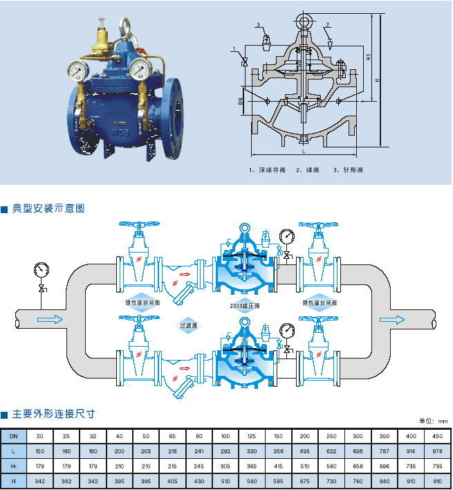 200X減壓閥是一種利用介質(zhì)自身能量了調(diào)節(jié)與控制管路壓力的智能型閥門。用于生活給水、消防給水及其他工業(yè)給水系統(tǒng),通過調(diào)節(jié)減壓導閥,即可調(diào)節(jié)主閥的出口壓力。出口壓力不因進口壓力、進口流量的變化而變化,安全可靠地將出口壓力維持在設定直上,并可根據(jù)需要調(diào)節(jié)設定直以達到減壓目的。該閥減壓精確,性能穩(wěn)定、安全可靠、安裝調(diào)節(jié)方便,使用壽命長。 |