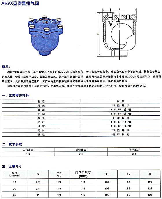 APVX自動排氣閥,在一般情況下,水中約含2V0L%的溶解空氣,在輸水過程中,這些空氣由水中不斷釋放出來,聚集在管線的高點處,形成空氣袋(AIR POCKET),使輸水變得困難,系統(tǒng)輸水能力可因此下降約5-15%。此微量排氣閥主要功能就是排除這2VOL%的溶解空氣,并適合裝置于高層建筑,廠區(qū)內配管,小型泵站用以保護或改善系統(tǒng)的輸水功率及節(jié)約能源。