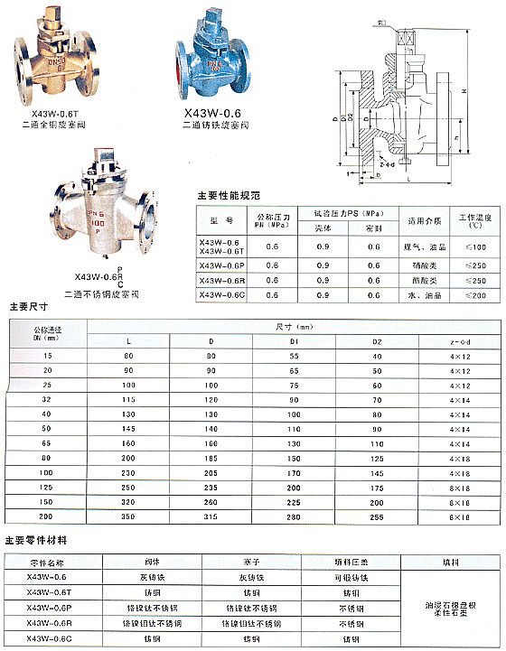 X43W二通全銅-鑄鐵-不銹鋼旋塞閥,主要性能規(guī)范: 型號 公稱壓力 (MPa) 試驗(yàn)壓力PS(MPa) 適用介質(zhì) 工作溫度(℃) 殼體 密封 X43W-10 1.0 1.5 1.1 煤氣、油品 ≤100 主要零件材料: 零件名稱 閥體 塞子 填料壓蓋 填料 X43W-10 鑄鐵 鑄鐵 鑄鐵 油浸石棉盤根 柔性石墨