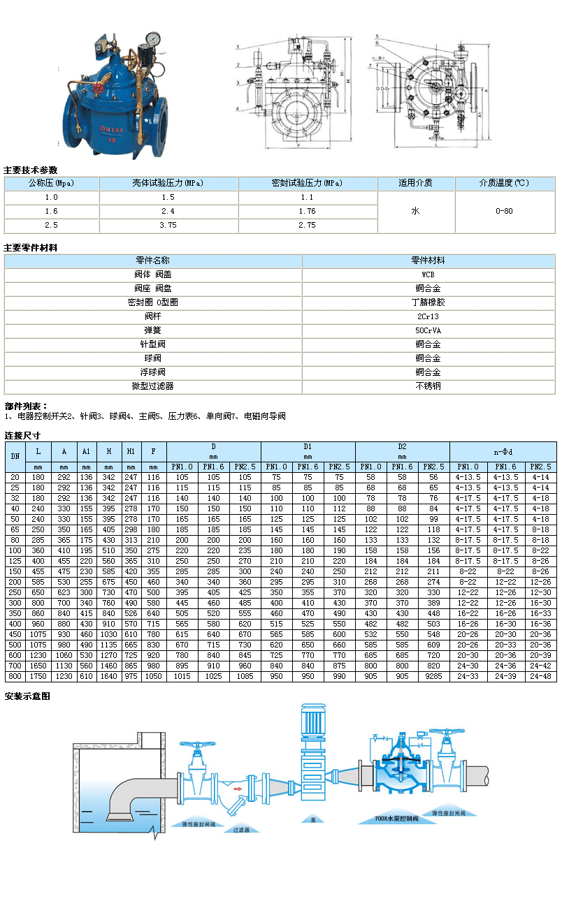 700X多功能水泵控制閥由主閥、電磁導(dǎo)閥、針閥、球閥、單向閥、行程開關(guān)、微形過濾器和壓力表組成水力控制接管系統(tǒng)。水泵需停止工作時(shí),先由進(jìn)口壓使主閥關(guān)閉90%后,水泵停止運(yùn)轉(zhuǎn)。剩余10%由回水關(guān)閉?煞乐顾N現(xiàn)象發(fā)生。本產(chǎn)品利用電磁導(dǎo)閥控制,不需要其它裝置和能源。節(jié)約能源,保養(yǎng)簡(jiǎn)便,停泵平穩(wěn)。電磁閥可采用交流電220V或直流電24V。本系列閥門產(chǎn)品廣泛用于高層建筑、生活區(qū)等供水管網(wǎng)系統(tǒng)及城市供水工程。當(dāng)水泵工作閥門向下游供水時(shí),電磁導(dǎo)閥全開,針閥調(diào)至適當(dāng)開度,上游水經(jīng)針閥、單向閥進(jìn)入主閥控制室,經(jīng)電磁導(dǎo)閥流出,此時(shí)主閥控制室的壓力保持主閥處于合適的開度,保持下游正常供水。當(dāng)水泵停止工作時(shí),電磁導(dǎo)閥先關(guān)閉,主閥控制室停止排水,控制室壓力升高,主閥開始關(guān)閉。當(dāng)關(guān)閉至90%時(shí),主閥上部行程開關(guān)輸出停泵信號(hào),水泵停止運(yùn)轉(zhuǎn)。此時(shí)下游回水經(jīng)單向閥進(jìn)入主閥控制室,控制室壓力升高,主閥被關(guān)閉。 |
